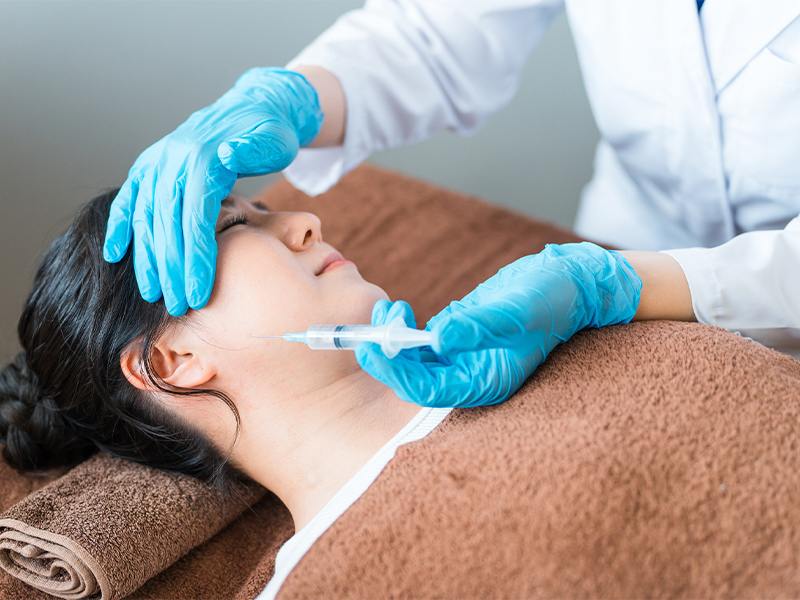 極細の針を使用して、リラックスさせたい筋肉(咬筋)に薬剤を注入します。チクッとする程度の痛みで、麻酔の必要もありません。施術自体はわずか5分〜10分程度で終了します。腫れや赤みもほとんど出ないため、施術後すぐにメイクをしてお帰りいただけます。